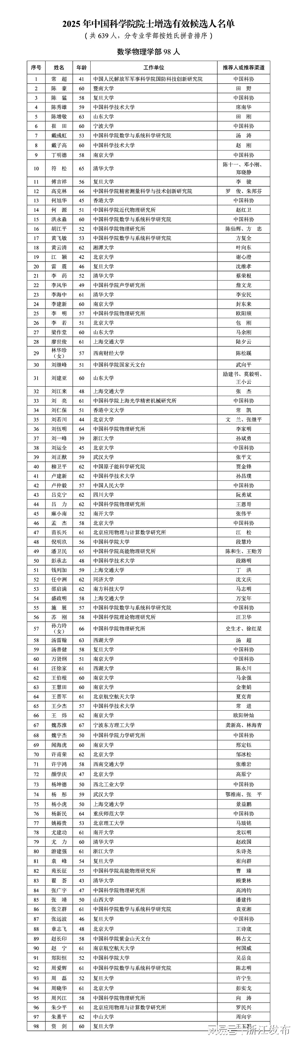 2025年中国科学院院士增选推荐工作已经结束。经中国科学院学部主席团审议,中国科学院党组审定,确认2025年中国科学院院士增选有效候选人639人。根据《中国科学院院士增选工作实施办法(试行)》的规定,现将有效候选人名单予以公布。